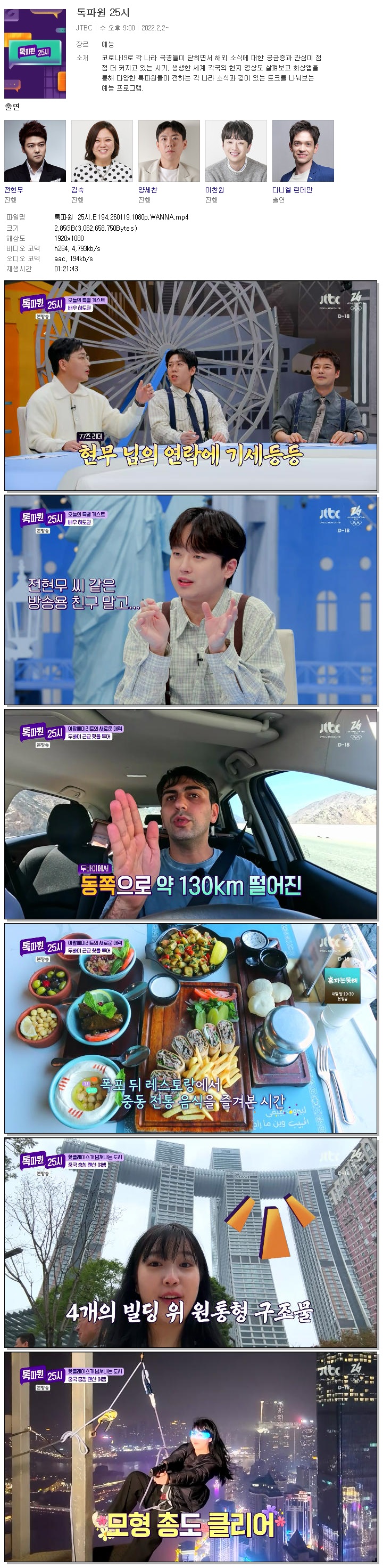 | [JTBC] 톡파원 25시.E194.260119.1080p.WANNA[하도권].mp4 | 2.9 G | 01:21:43 | 1920x1080 |