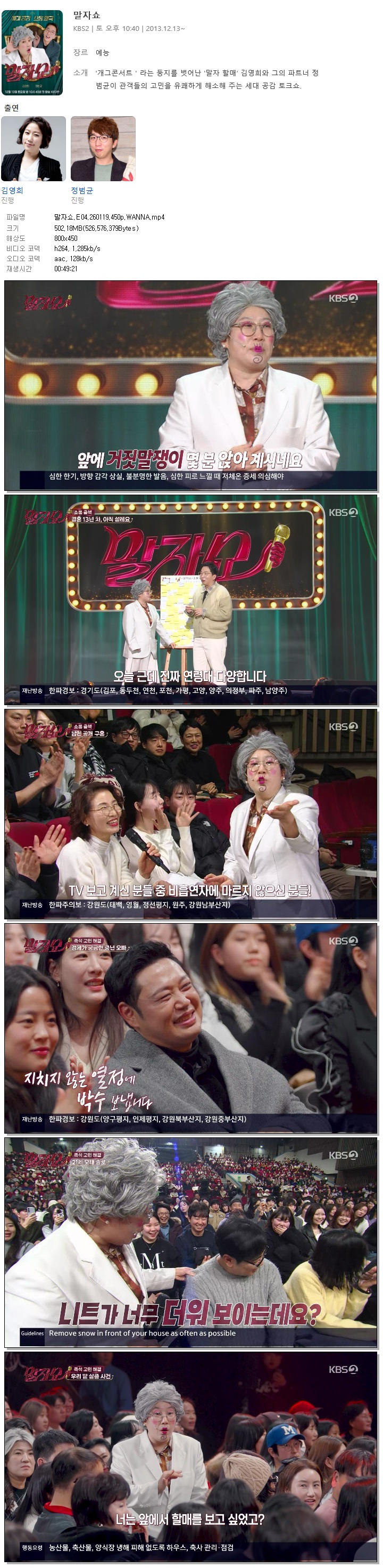 | [KBS2] 말자쇼.E04.260119.450p.WANNA[김영희, 정범균].mp4 | 502.2 M | 00:49:21 | 800x450 |