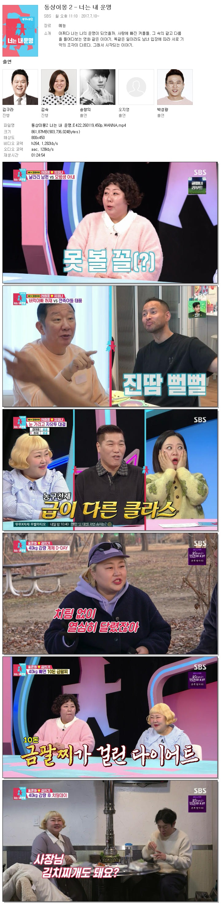 | [SBS] 동상이몽2 너는 내 운명.E422.260119.450p.WANNA[전태풍, 홍윤화].mp4 | 861.9 M | 01:24:54 | 800x450 |