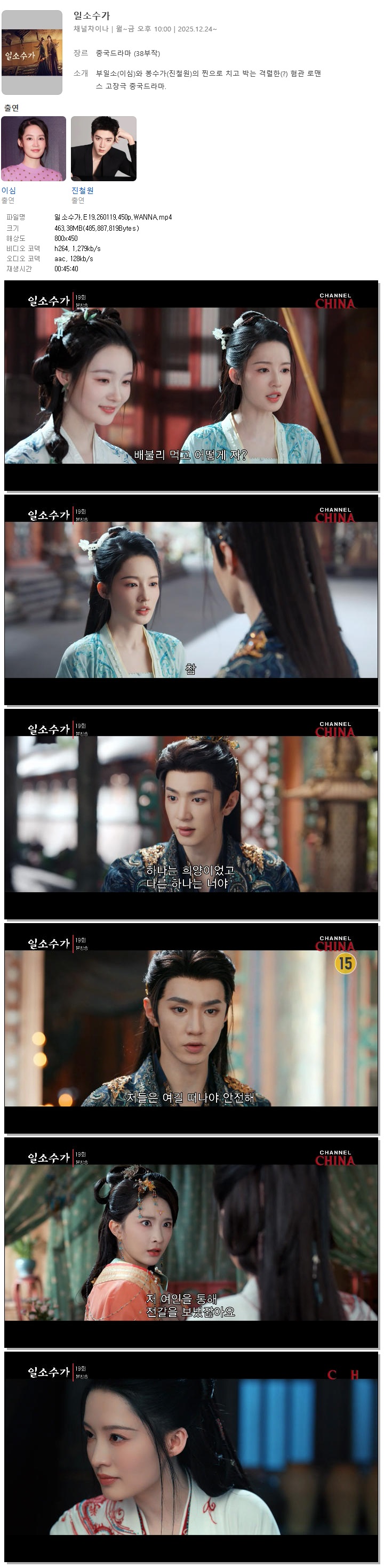 | [채널차이나] 일소수가.E19.260119.450p.WANNA[이심, 진철원].mp4 | 463.4 M | 00:45:40 | 800x450 |