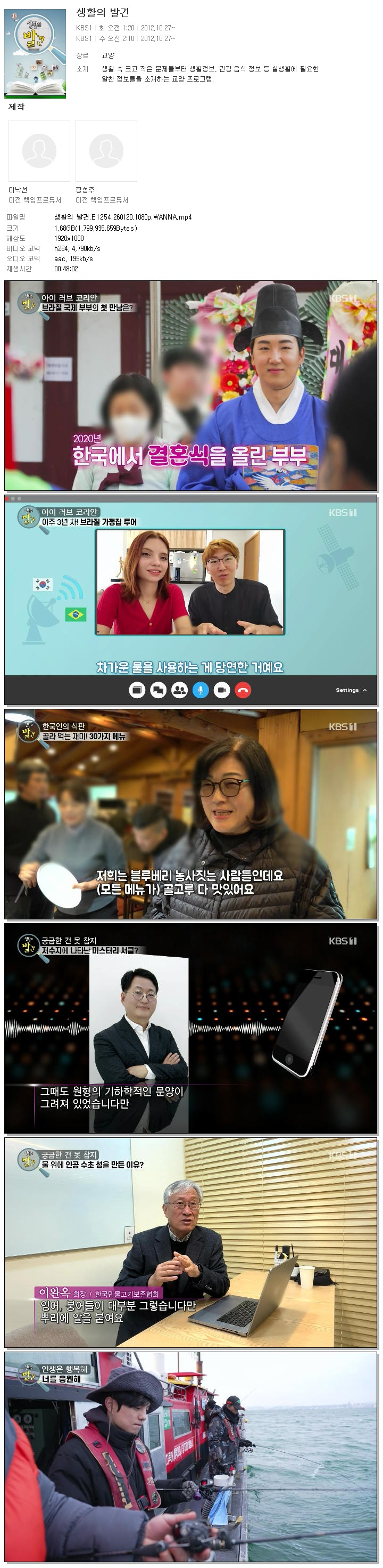 | [KBS1] 생활의 발견.E1254.260120.1080p.WANNA.mp4 | 1.7 G | 00:48:02 | 1920x1080 |