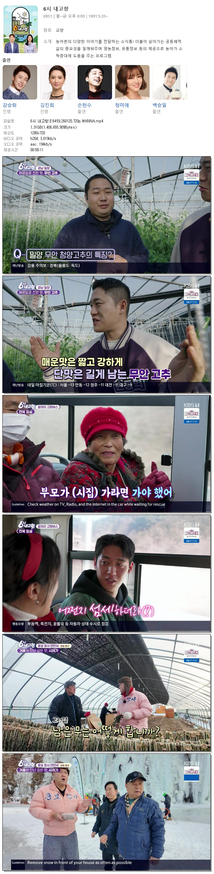 [KBS1] 6시 내고향.E8459.260120.720p.WANNA[강승화, 김진희].mp4 1.3 G 00:58:11 1280x720