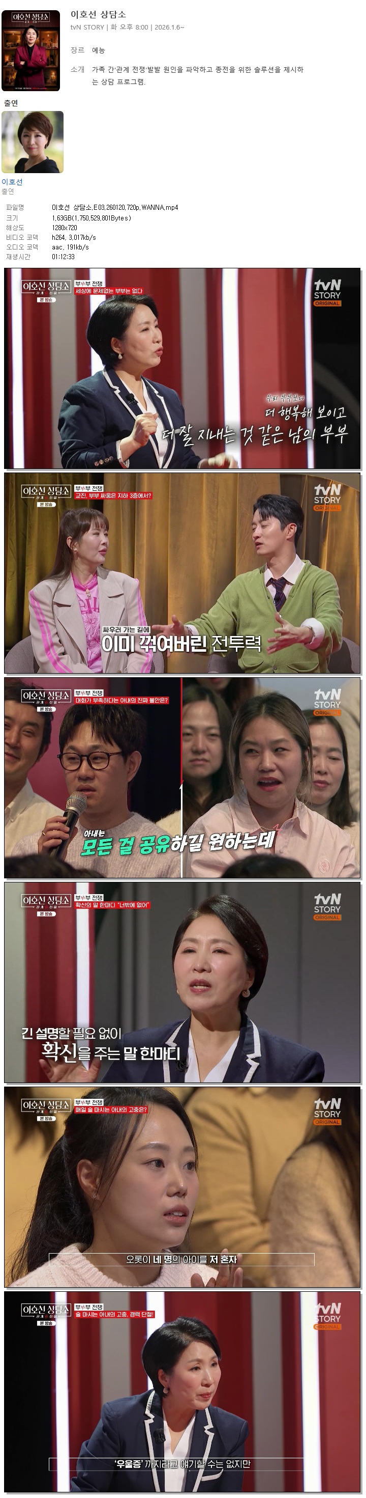 [TVN STORY] 이호선 상담소.E03.260120.720p.WANNA[이호선].mp4 1.6 G 01:12:33 1280x720