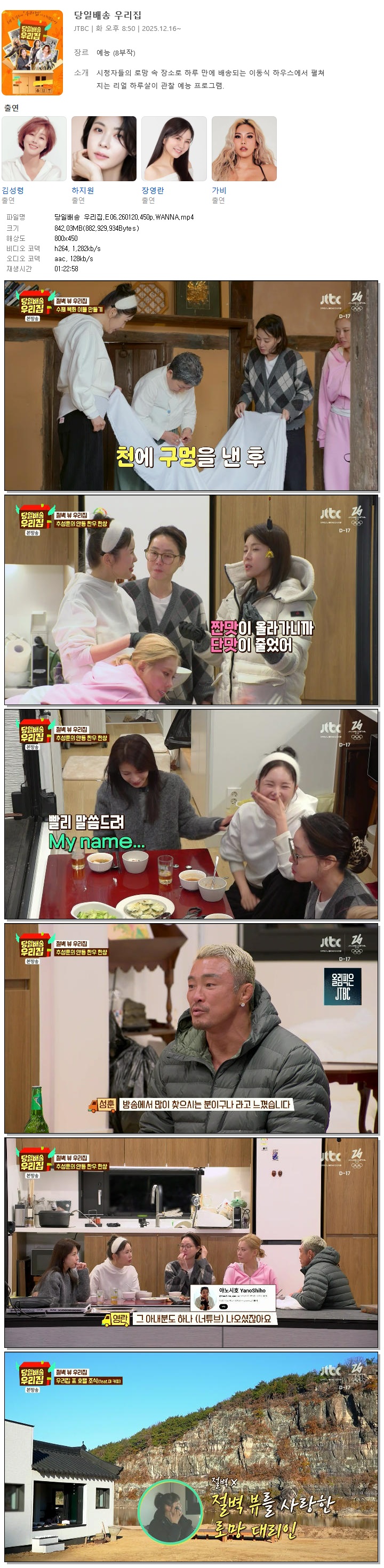 [JTBC] 당일배송 우리집.E06.260120.450p.WANNA[추성훈, 장영란].mp4 842 M 01:22:58 800x450