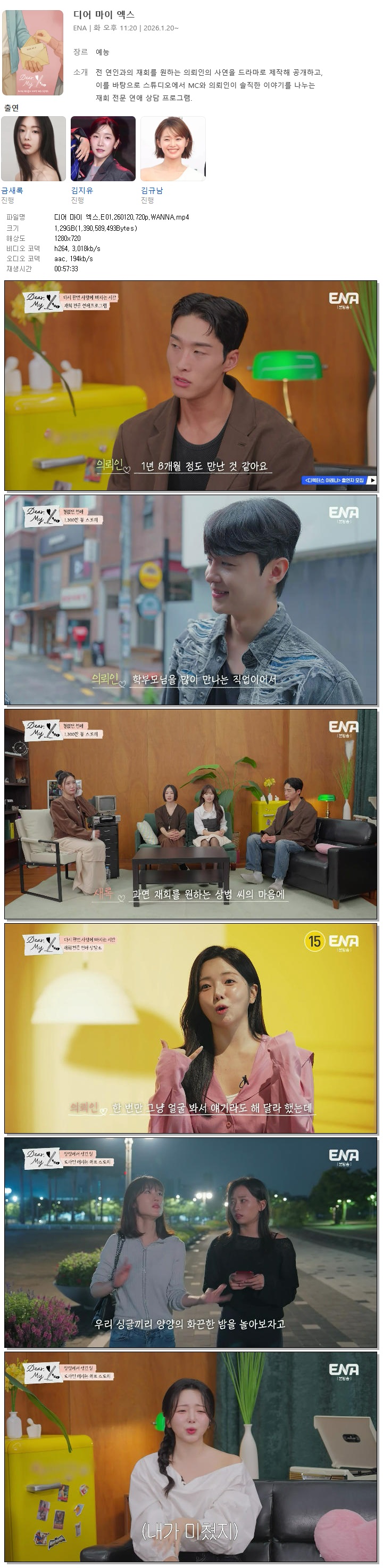 [ENA] 디어 마이 엑스.E01.260120.720p.WANNA[금새록, 김지유].mp4 1.3 G 00:57:33 1280x720