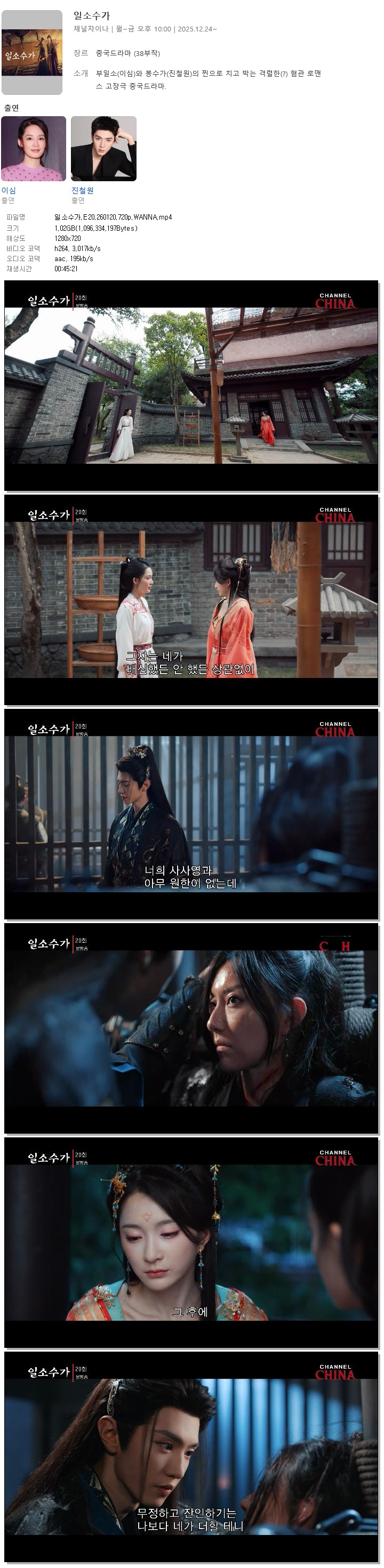 | [채널차이나] 일소수가.E20.260120.720p.WANNA[이심, 진철원].mp4 | 1 G | 00:45:21 | 1280x720 |