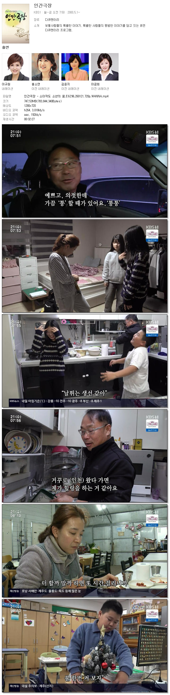 | [KBS1] 인간극장.E6296.260121.720p.WANNA.mp4 | 747.5 M | 00:32:27 | 1280x720 |