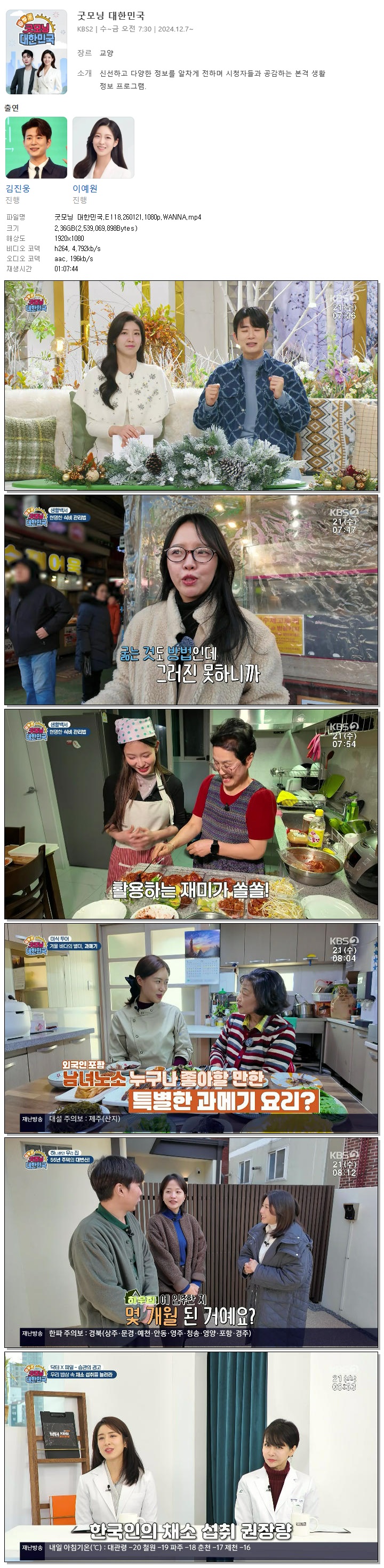| [KBS2] 굿모닝 대한민국.E118.260121.1080p.WANNA[김진웅, 이예원].mp4 | 2.4 G | 01:07:44 | 1920x1080 |