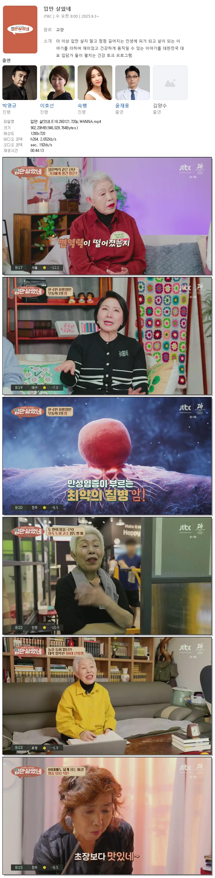 | [JTBC] 입만 살았네.E18.260121.720p.WANNA[박영규, 이호선].mp4 | 902.2 M | 00:44:13 | 1280x720 |