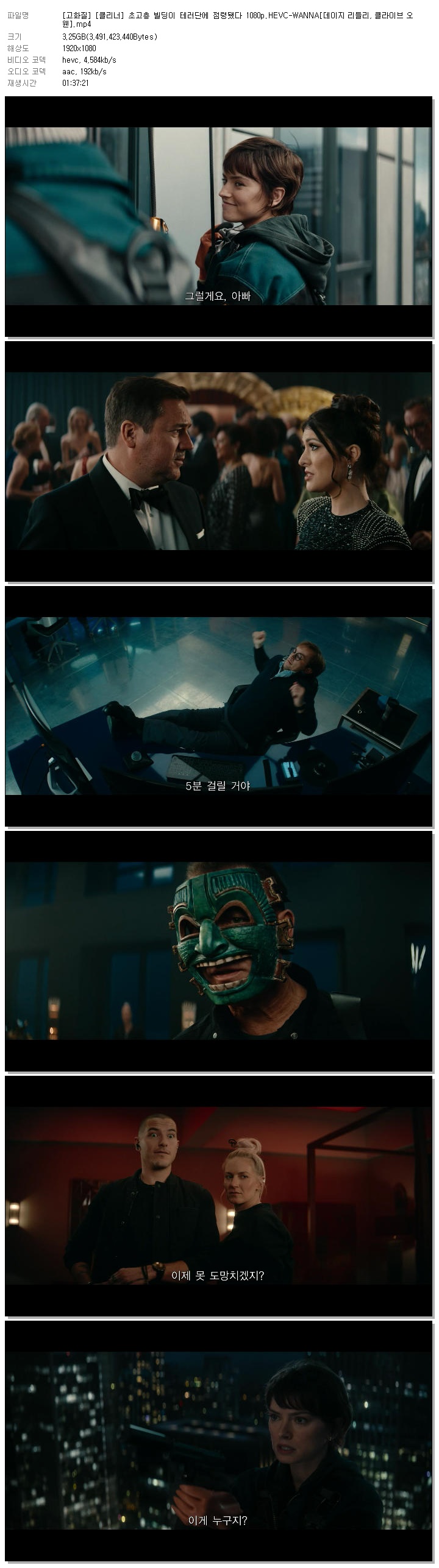 [고화질] [클리너] 초고층 빌딩이 테러단에 점령됐다 1080p.HEVC-WANNA[데이지 리들리, 클라이브 오웬].mp4 3.3 G 01:37:21 1920x1080