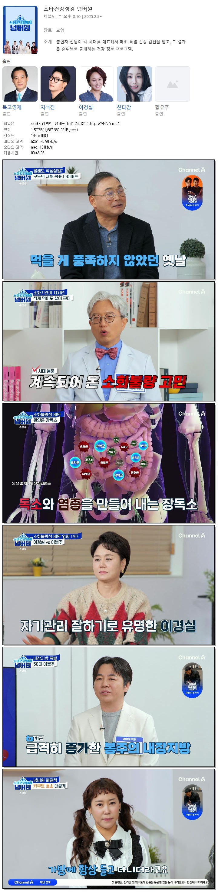 | [채널A] 스타건강랭킹 넘버원.E31.260121.1080p.WANNA[지석진, 이세창].mp4 | 1.6 G | 00:45:05 | 1920x1080 |