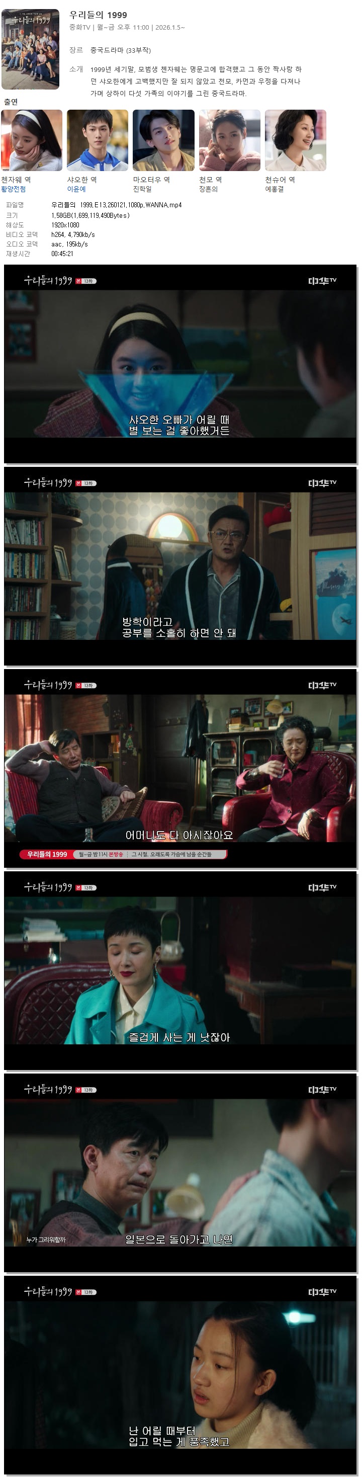 | [중화TV] 우리들의 1999.E13.260121.1080p.WANNA[황양전첨, 이윤예].mp4 | 1.6 G | 00:45:21 | 1920x1080 |