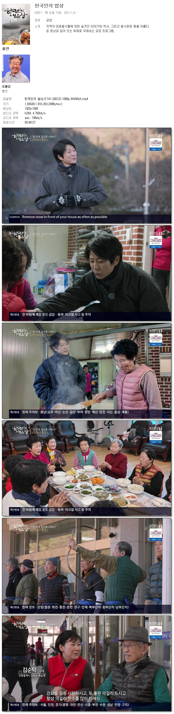 | [KBS1] 한국인의 밥상.E741.260122.1080p.WANNA.mp4 | 1.7 G | 00:48:27 | 1920x1080 |