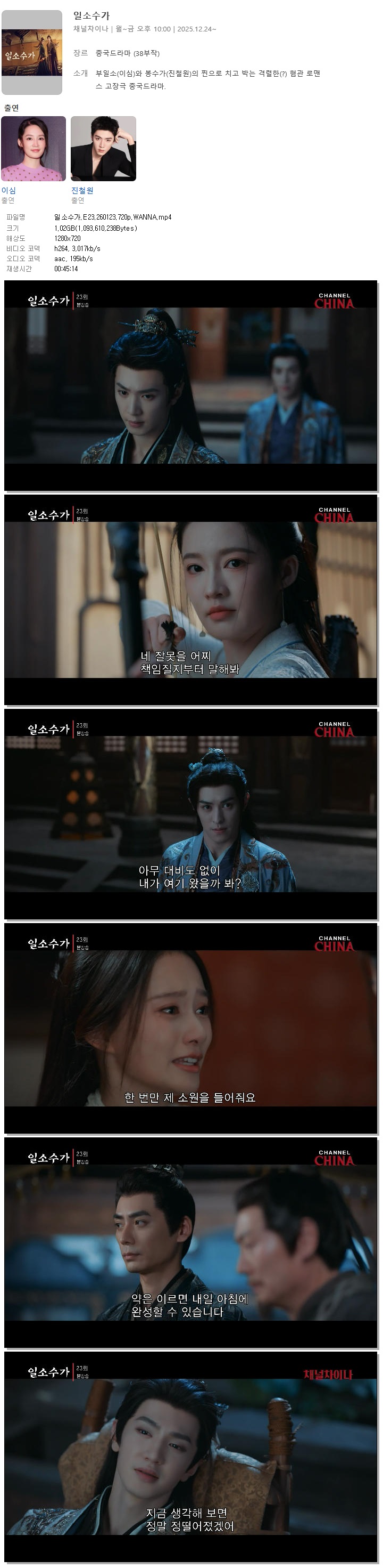 | [채널차이나] 일소수가.E23.260123.720p.WANNA[이심, 진철원].mp4 | 1 G | 00:45:14 | 1280x720 |
