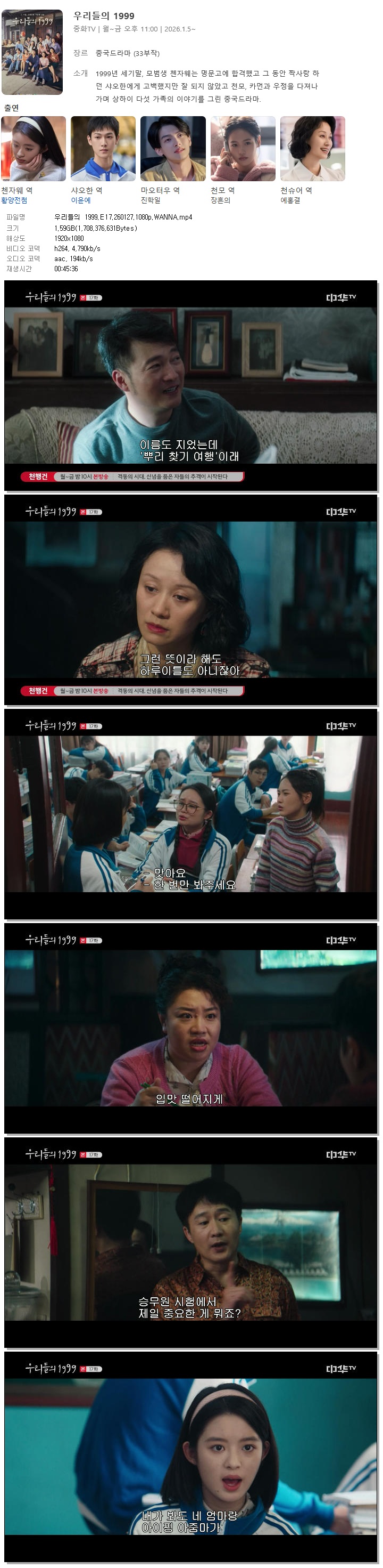 | [중화TV] 우리들의 1999.E17.260127.1080p.WANNA[황양전첨, 이윤예].mp4 | 1.6 G | 00:45:36 | 1920x1080 |