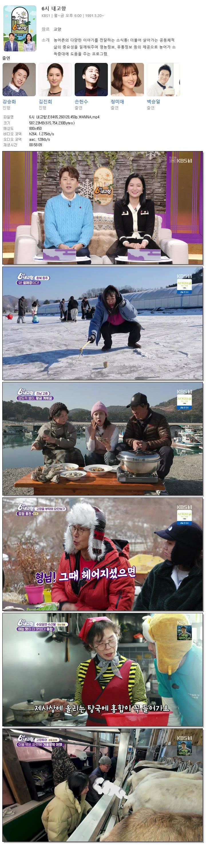 | [KBS1] 6시 내고향.E8465.260128.450p.WANNA[강승화, 김진희].mp4 | 587.2 M | 00:58:09 | 800x450 |
