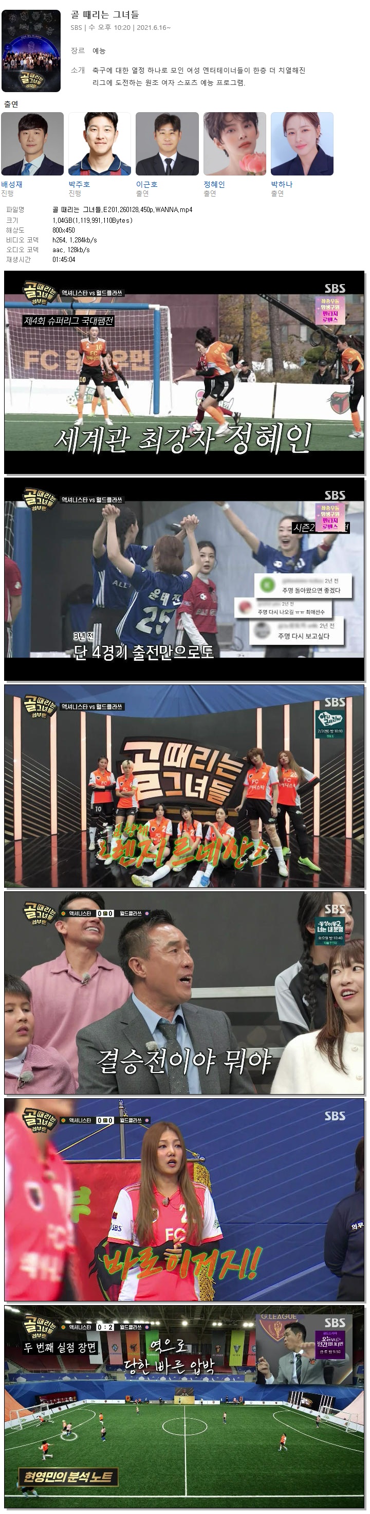 | [SBS] 골 때리는 그녀들.E201.260128.450p.WANNA[정혜인, 나티].mp4 | 1 G | 01:45:04 | 800x450 |