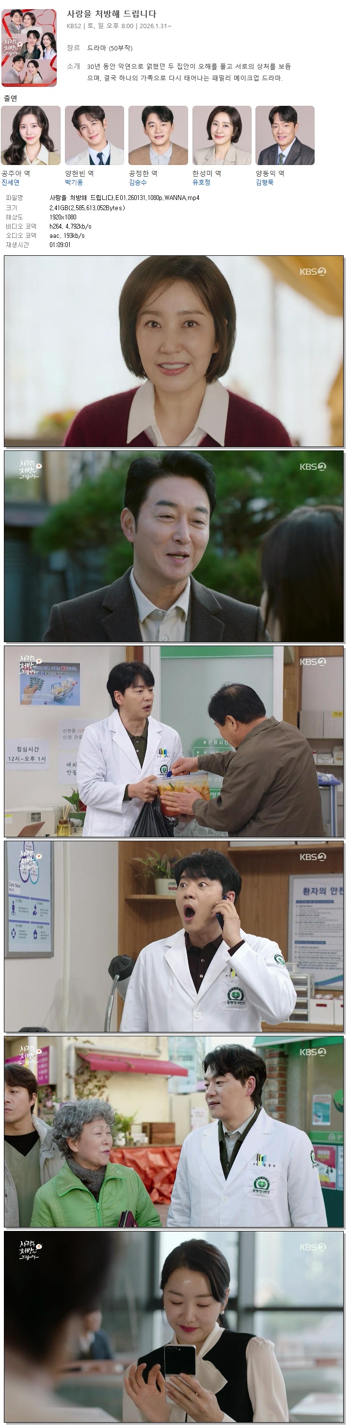 [KBS2] 사랑을 처방해 드립니다.E01.260131.1080p.WANNA[진세연, 박기웅] 다시보기 토렌트