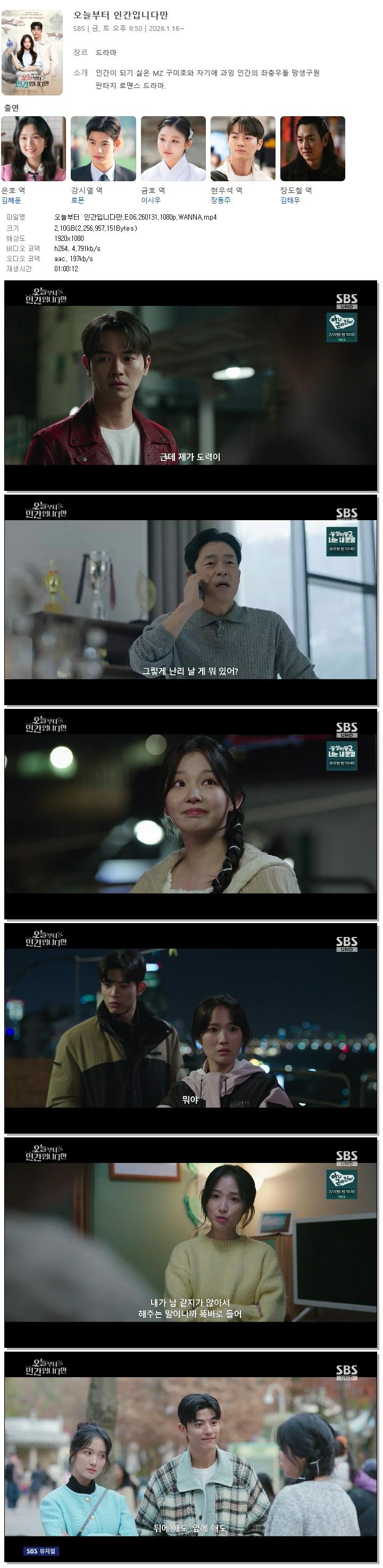 [SBS] 오늘부터 인간입니다만.E06.260131.1080p.WANNA[김혜윤, 로몬].mp4 2.1 G 01:00:12 1920x1080