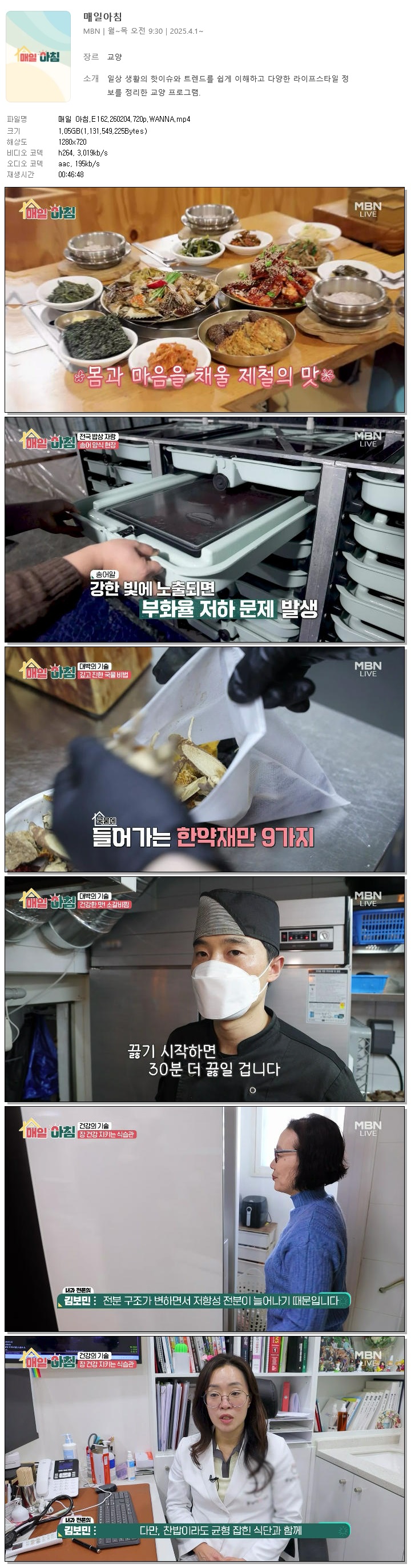 | [MBN] 매일 아침.E162.260204.720p.WANNA[한혜원, 이정수].mp4 | 1.1 G | 00:46:48 | 1280x720 |