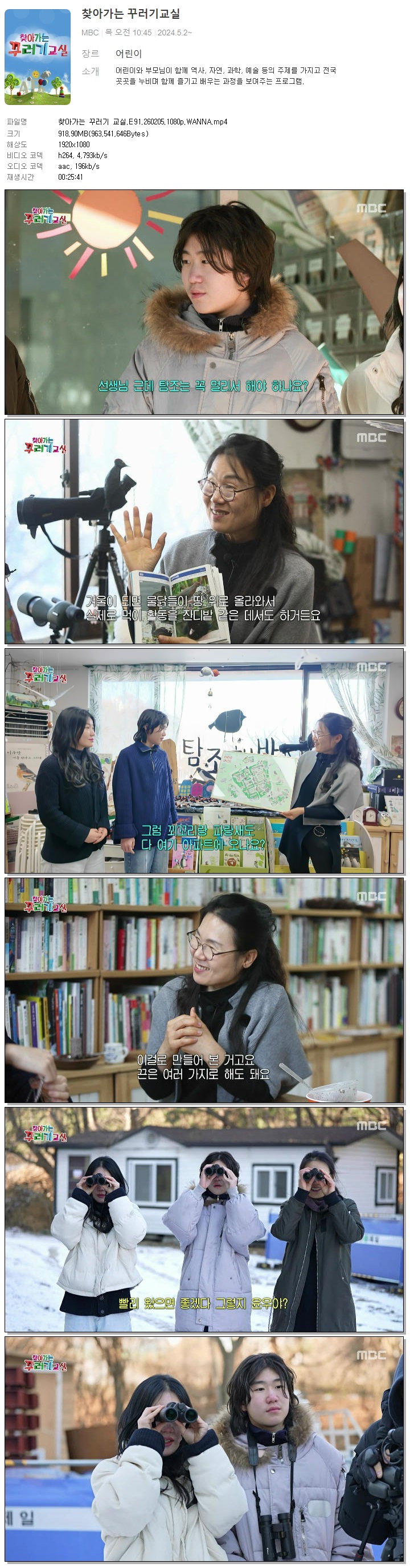 | [MBC] 찾아가는 꾸러기 교실.E91.260205.1080p.WANNA.mp4 | 918.9 M | 00:25:41 | 1920x1080 |
