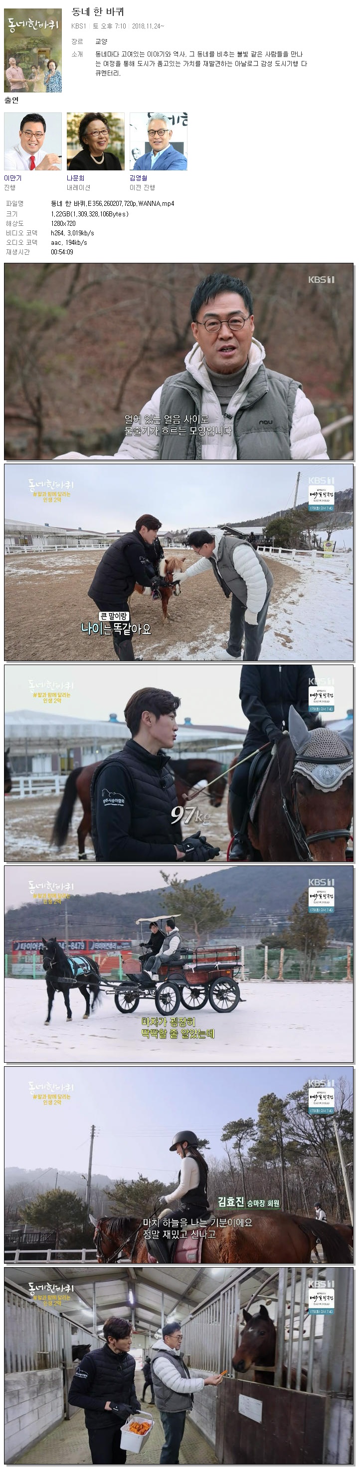 | [KBS1] 동네 한 바퀴.E356.260207.720p.WANNA[이만기].mp4 | 1.2 G | 00:54:09 | 1280x720 |
