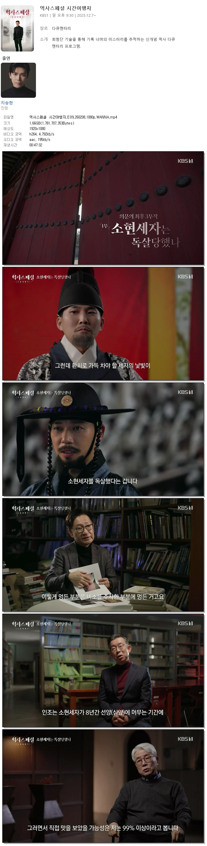 | [KBS1] 역사스페셜 시간여행자.E09.260208.1080p.WANNA[지승현].mp4 | 1.7 G | 00:47:32 | 1920x1080 |