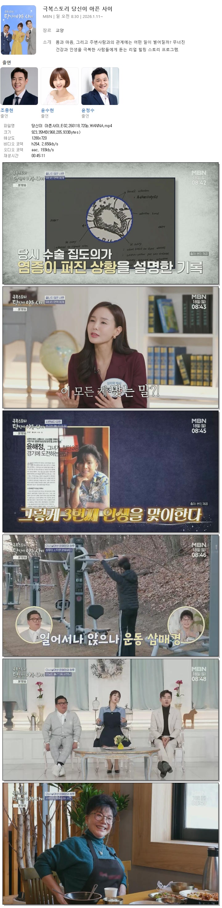 | [MBN] 당신이 아픈사이.E02.260118.720p.WANNA[조충현, 윤수현].mp4 | 923.4 M | 00:45:11 | 1280x720 |