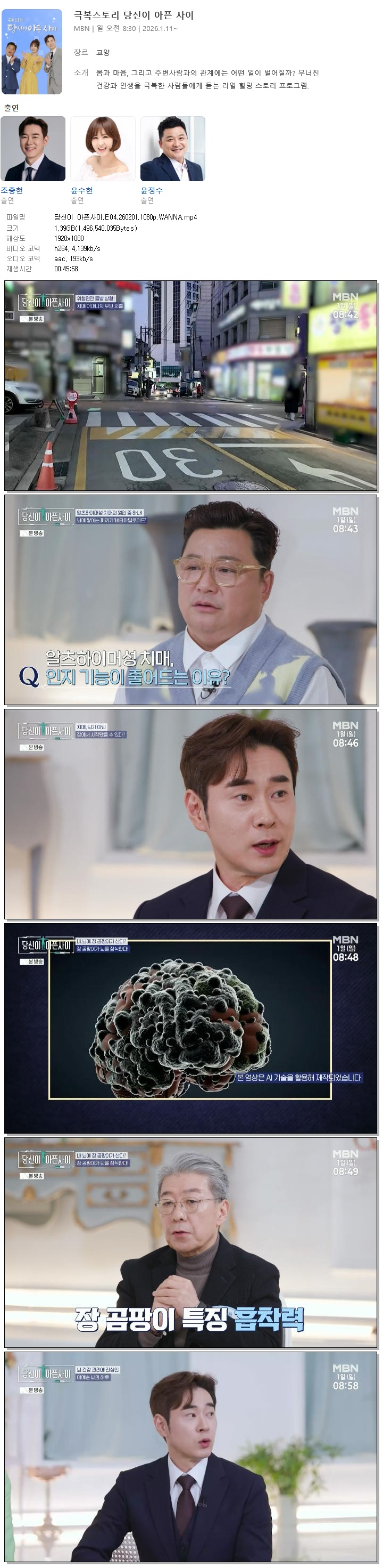 | [MBN] 당신이 아픈사이.E04.260201.1080p.WANNA[조충현, 윤수현].mp4 | 1.4 G | 00:45:58 | 1920x1080 |