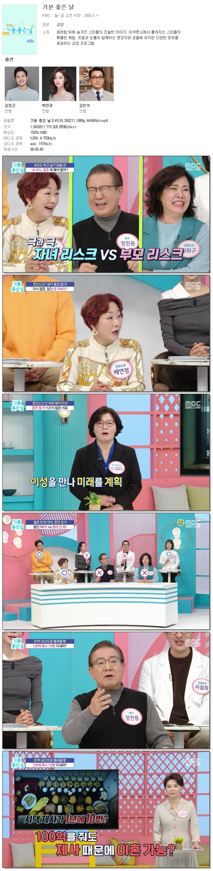 나이 들수록 사라지는 노후 재산과 건강! 꽉 붙잡지 않으면 그대로 파산한다? 부모 vs 자식 재산 갈등부터 노후 무너지는 면역력 지키는 법까지 〈기분 좋은 날〉에서 확인하세요~ ▶ 돈 앞에서 무너지는 가족 사랑 아들 사망 후 받은 부의금 시어머니 vs 며느리, 법적 주인은 누구? 행복한 새 출발 꿈꾸는 결혼식 자칫하면 〈이것〉 폭탄 맞는다? 돈 앞에서 벌어진 가족 전쟁 해결법은? ▶ 이 결혼 반댈세! 끝나지 않은 가족 전쟁 황혼 재혼 꿈꾸는 부모 자식 눈치 보느라 결혼 못 한다? 부모 vs 자식 간 다툼 없는 황혼 재혼 꿀팁! 〈이것〉 활용하라! 가족 갈등 NO! 이인철 변호사와 염지훈 세무사의 특급 솔루션은 과연? ▶ 암의 습격을 피하려면? 면역력을 잡아라 할리우드 배우 올리비아 먼 암 경각심을 알리기 위해 〈이것〉까지 했다? 헷갈리는 가족암 vs 유전암 차이부터 면역력 붙잡고 암을 이겨낼 방법은? ▶ ‘탈모’가 질병의 위험 신호? 남녀노소 가리지 않는 탈모! 다름 아닌 전신 건강의 적신호다? 탈모가 부르는 의외의 질환부터 탈모 때문에 벌어진 황당 사연까지 대공개!