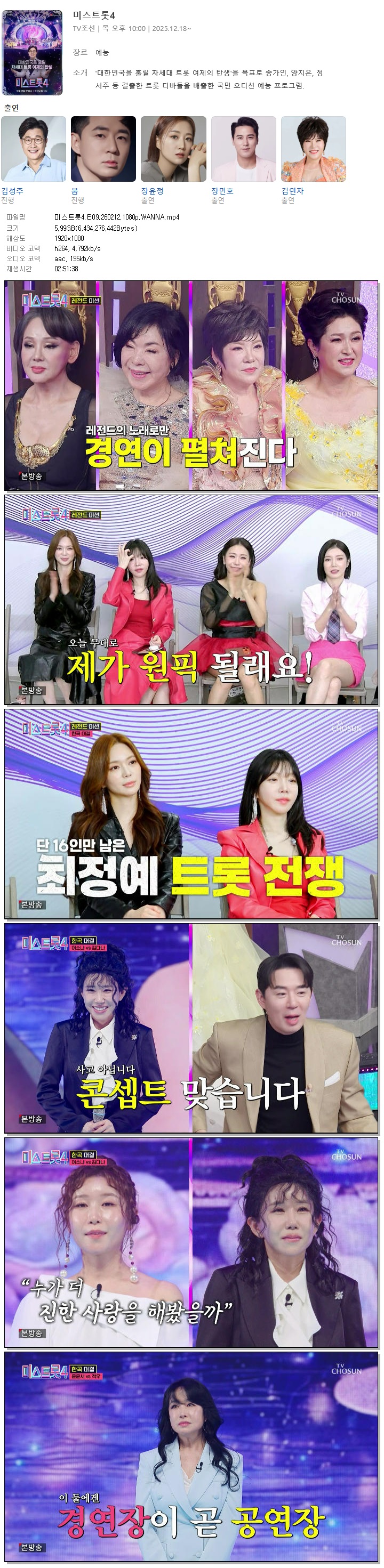 [TV조선] 미스트롯4.E09.260212.1080p.WANNA[김수희, 김연자].mp4 6 G 02:51:38 1920x1080