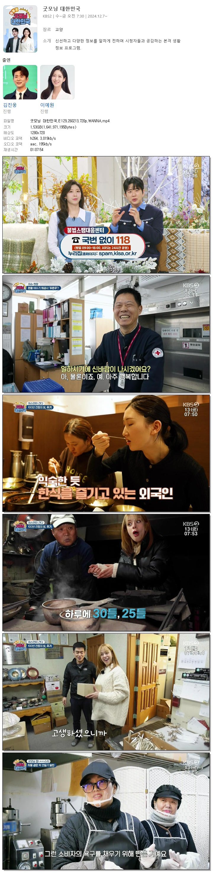 | [KBS2] 굿모닝 대한민국.E129.260213.720p.WANNA[김진웅, 이예원].mp4 | 1.5 G | 01:07:54 | 1280x720 |
