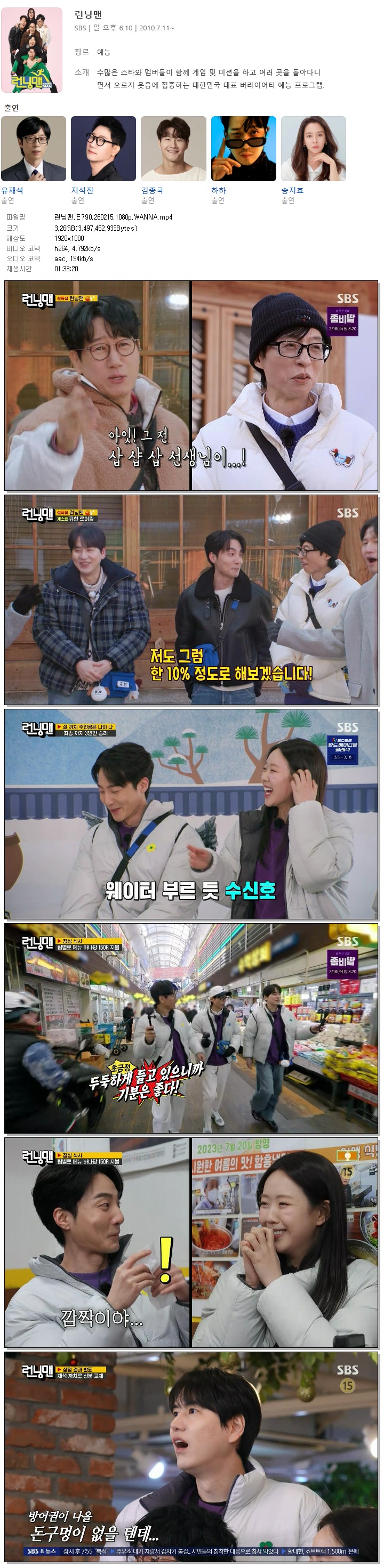 | [SBS] 런닝맨.E790.260215.1080p.WANNA[규현, 로이킴].mp4 | 3.3 G | 01:33:20 | 1920x1080 |