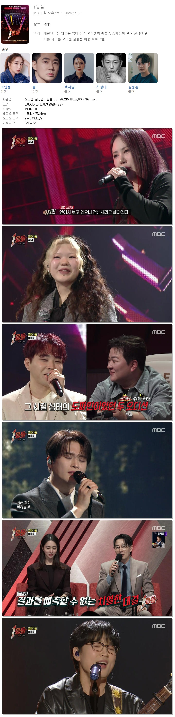 | [MBC] 오디션 끝장전 1등들.E01.260215.1080p.WANNA[이민정, 백지영].mp4 | 5.1 G | 02:24:52 | 1920x1080 |