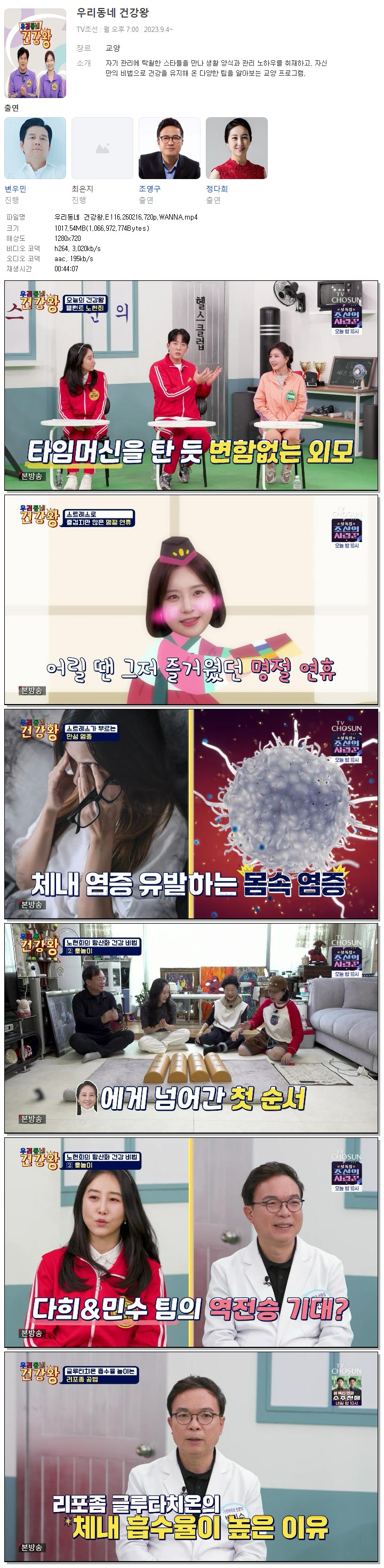 | [TV조선] 우리동네 건강왕.E116.260216.720p.WANNA[변우민, 최은지].mp4 | 1017.5 M | 00:44:07 | 1280x720 |