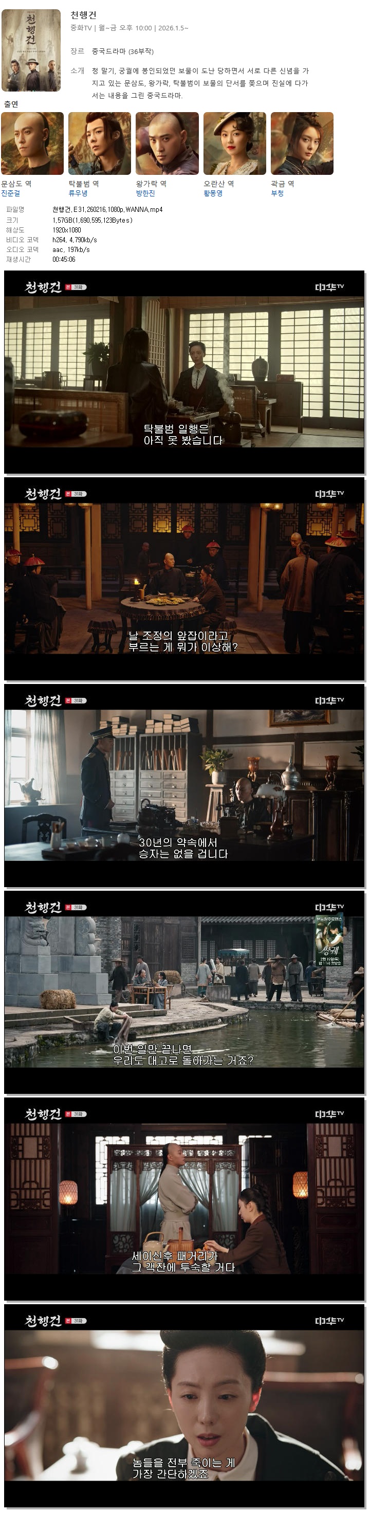 | [중화TV] 천행건.E31.260216.1080p.WANNA[진준걸, 류우녕].mp4 | 1.6 G | 00:45:06 | 1920x1080 |