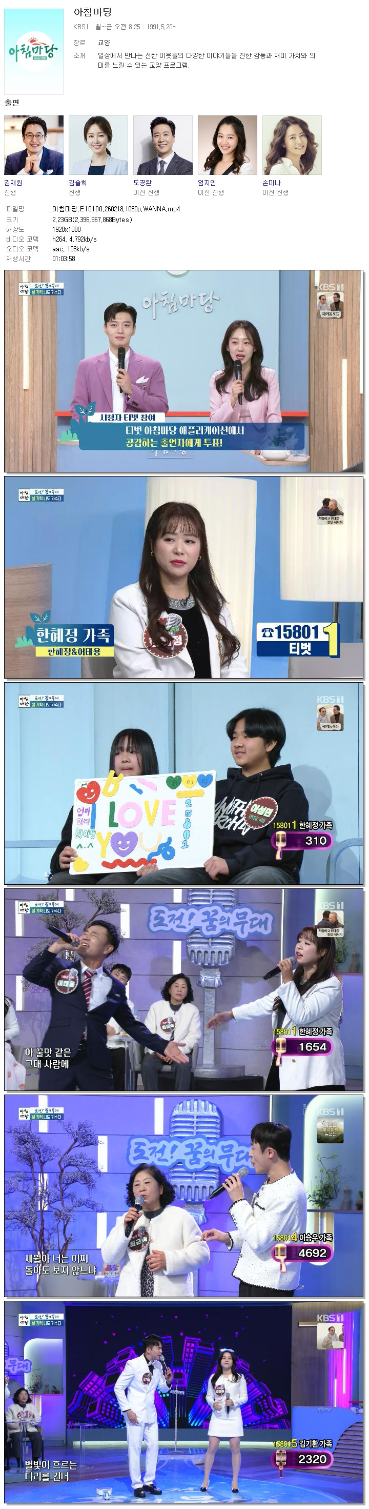 | [KBS1] 아침마당.E10100.260218.1080p.WANNA[김재원, 엄지인].mp4 | 2.2 G | 01:03:58 | 1920x1080 |