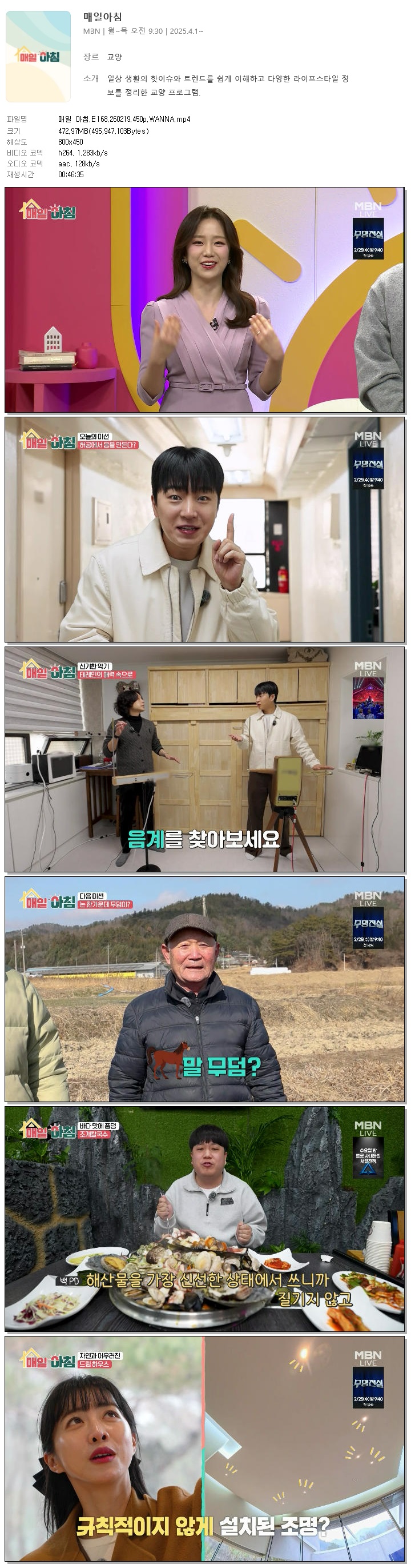 | [MBN] 매일 아침.E168.260219.450p.WANNA[한혜원, 이정수].mp4 | 473 M | 00:46:35 | 800x450 |