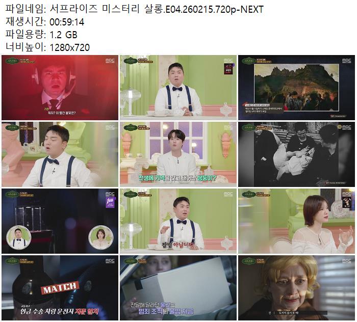 | 서프라이즈 미스터리 살롱.E04.260215.720p-NEXT.mp4 | 1.2 G | - | 1280x720 |
