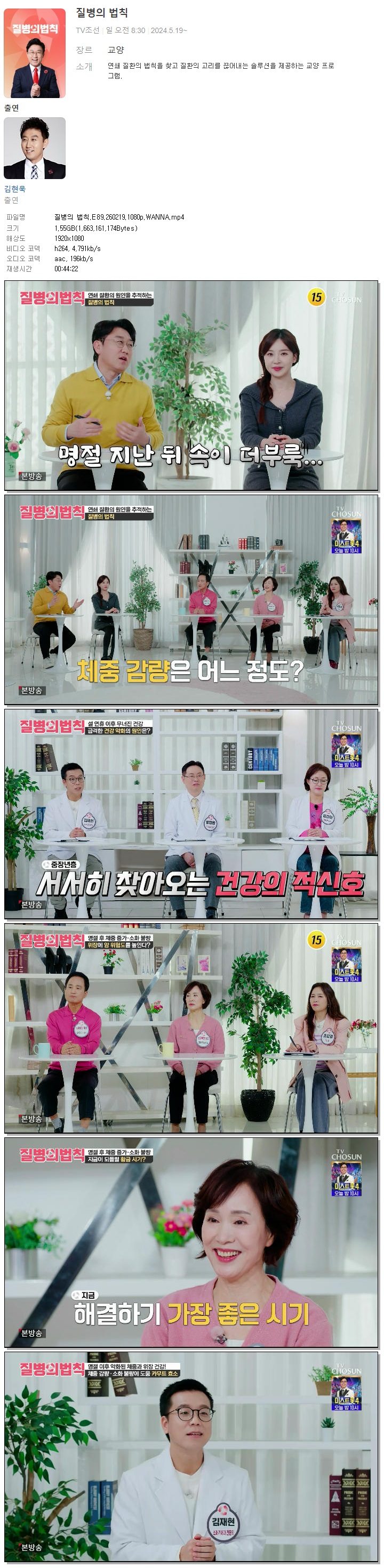 | [TV조선] 질병의 법칙.E89.260219.1080p.WANNA[김현욱].mp4 | 1.5 G | 00:44:22 | 1920x1080 |