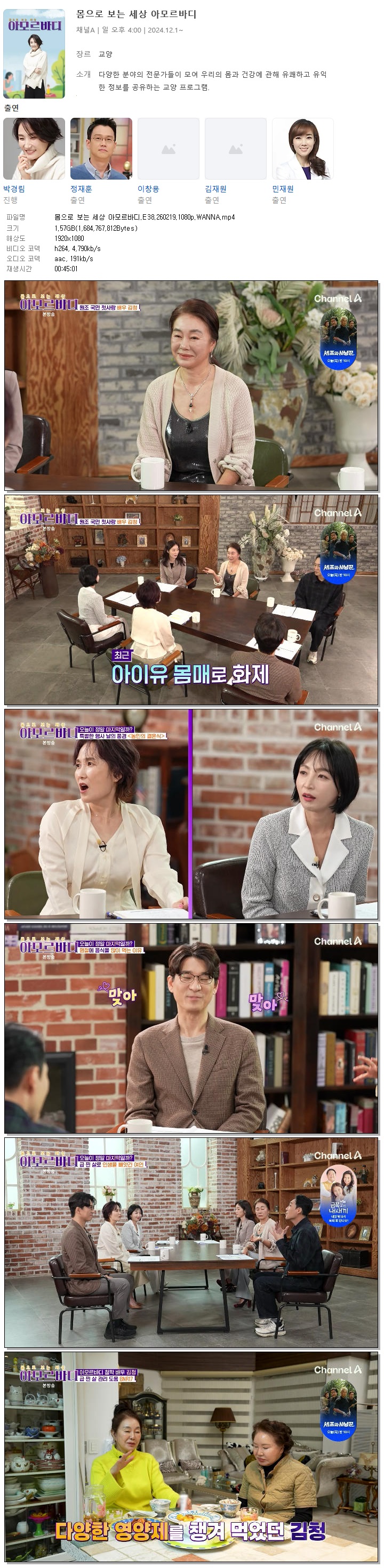 | [채널A] 몸으로 보는 세상 아모르바디.E38.260219.1080p.WANNA[박경림].mp4 | 1.6 G | 00:45:01 | 1920x1080 |