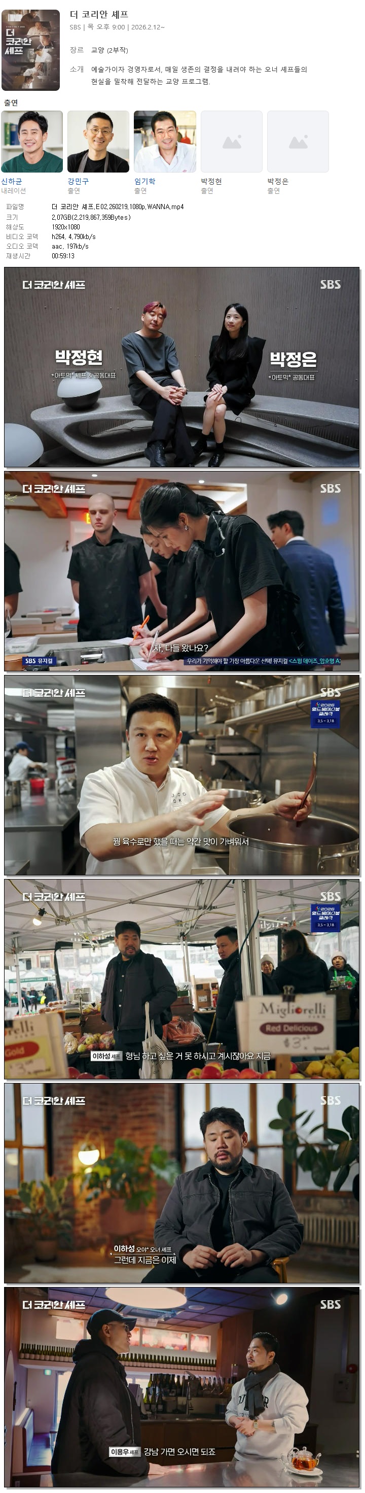 | [SBS] 더 코리안 셰프.E02.260219.1080p.WANNA[강민구, 임기학].mp4 | 2.1 G | 00:59:13 | 1920x1080 |