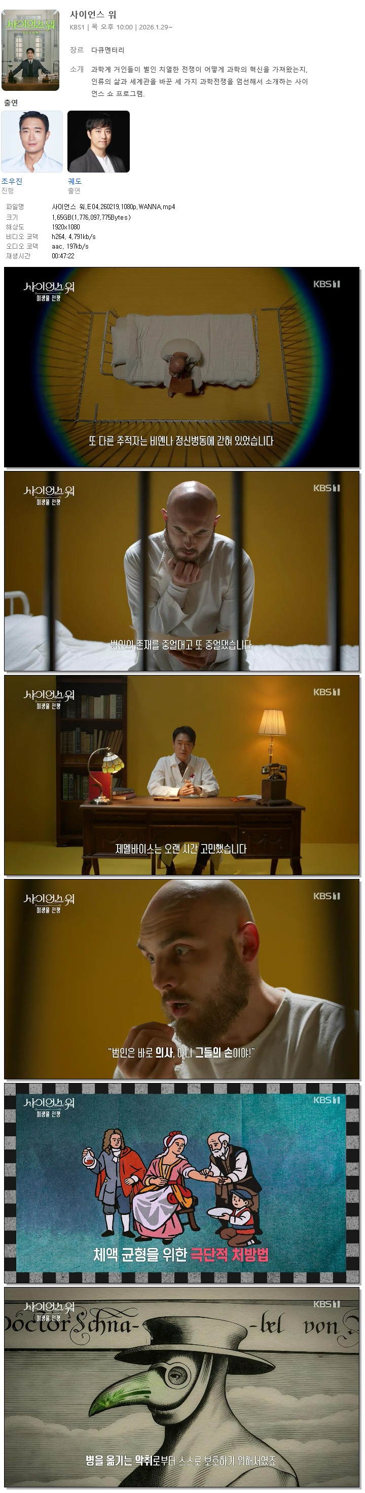 과학은 언제나 하나의 질문에서 시작됐다. 오늘날 우리가 누리는 과학기술과 문명의 진보 뒤에는 집요한 질문과 수많은 가설, 반증과 실패를 거듭한 과학계 거인들의 치열한 전쟁이 있었다. 관전 포인트 ① 조우진 X 궤도, 과학을 ‘이야기’로 풀어내는 최적의 조합 믿고 보는 명품 배우 조우진과 이 시대 가장 주목받는 과학 커뮤니케이터 궤도의 만남. 이 조합만으로도 1회부터 화제를 모았던 '사이언스 워:거인의 전쟁'이 이번엔 ‘생명의 미스터리’ 속으로 들어간다. 무대는 1950년대, 생명의 비밀을 두고 과학자들이 숨 막히는 레이스를 벌였던 현장이다. 조우진은 주요 인물들 사이를 오가며 야망과 집착, 그리고 과학적 신념이 교차하던 과학 전쟁의 순간을 연극적 호흡과 섬세한 감정 연기로 풀어낸다. 천의 얼굴, 조우진의 연기는 어려운 과학을 감정과 서사가 살아있는 ‘사람 이야기’로 바꿔놓는다. 여기에 궤도의 명쾌한 설명이 더해지며 시청자는 복잡한 과학 이론을 자연스럽게 이해하게 된다. 관전 포인트 ② 초대형 세트 ‘여섯 개의 방’, 시공간을 넘나드는 과학 드라마 '사이언스 워'는 초대형 스튜디오에 구현된 여섯 개의 공간을 무대로 과학사의 결정적 순간들을 입체적으로 재현한다. 기존 교양 프로그램에서 보기 힘들었던 화려한 세트, 정교하게 설계된 카메라 동선, 영화적 조명과 음악이 어우러지며 강렬한 시청각적 몰입을 선사한다. 공영방송 KBS가 축적한 다큐 제작 노하우에 연극적 무대를 결합한 새로운 과학 프로그램의 탄생. 과학 이론의 충돌과 그 끝에 탄생한 결정적 순간들이 마치 한 편의 영화처럼 눈앞에 펼쳐친다. 관전포인트 ③ ‘어렵지 않지만, 얕지 않은’ 과학 스토리텔링 재미와 지적 유희를 동시에 충족시키는 지식 콘텐츠가 넘쳐나는 시대. 하지만 질문의 ‘맥락’까지 짚어주는 프로그램은 드물다. '사이언스 워:거인의 전쟁'은 이 지점에서 출발한다. 과학을 단순히 ‘쉽고, 재밌게’ 설명하는 데서 멈추지 않고 왜 그 질문이 시작됐고, 어떻게 이어져 왔는지를 이야기로 풀어낸다. 생명의 궁금증에서 출발한 질문은 멘델과 슈뢰딩거를 거쳐 DNA 구조 발견이라는 결정적 순간에 이르고, 시청자는 과학자들의 치열한 이론 전쟁이 왜 중요했는지 그리고 오늘날 우리의 삶과 어떻게 연결되는지를 알게 된다.과학이 처음인 시청자부터 익숙한 시청자까지 모두가 즐길 수 있는 과학 스토리텔링이 강점이다. * 사이언스워는 한국과학창의재단의 ‘2025년 과학프로그램 지원사업’ 선정작이다 '사이언스 워:거인의 전쟁' 2회 – DNA 전쟁 : 왓슨과 크릭 ■ 과학계의 문제아 제임스 왓슨 타계, 재조명되는 DNA 구조 발견 지난해 11월 6일 제임스 왓슨 (향년 97세)의 타계 소식과 함께 그의 업적이 재조명되고 있다. 제임스 왓슨과 프랜시스 크릭이 1953년 발표한 128줄짜리 단 한 장의 논문은 과학사의 흐름을 바꿔 놓았다. 하지만 그 순간에 이르기까지, 인류는 오랫동안 ‘생명이란 무엇인가’, ‘부모의 특징은 어떻게 다음 세대로 전해지는가?’라는 질문 앞에서 답을 찾지 못했다. 당시 이름조차 알려지지 않았던 젊은 풋내기 과학자 왓슨과 크릭은 어떻게 가장 먼저 생명의 설계도를 손에 넣을 수 있었을까? '사이언스 워:거인의 전쟁' 두 번째, 생명의 비밀에 도전한 과학자들의 치열한 전쟁의 서막이 오른다. ■ 풀리지 않는 미스터리 ‘생명이란 무엇인가’ 20세기 중반, 과학의 중심은 흔들리고 있었다. 세계대전과 경제 대공황을 겪으며 물리학자들은 과학이 인류를 구하지 못했다는 깊은 회의에 빠진다. 그때, 한 물리학자가 던진 질문이 과학계를 뒤흔든다. ‘생명이란 무엇인가’. 슈뢰딩거의 이 질문은 생명을 물리 화학의 언어로 풀 수 있다는 도발적인 가능성을 제시했고, 방황하던 젊은 과학자들은 생물학이라는 미지의 영역으로 향한다. 19세기 멘델이 유전학의 문을 열고, 20세기 초 모건이 초파리 실험으로 유전 정보가 염색체에 있다는 사실을 밝혀낸 뒤, 과학자들은 마침내 유전물질의 주인공이 DNA라는 사실에 도달한다. 그러나 그들 앞에는 또 다른 난제가 남는다. ‘DNA는 어떤 구조로 생명 정보를 담고 있는가?’ ■ DNA 구조를 둘러싼 사상 초유의 과학 레이스 1950년대, DNA 구조를 밝히기 위해 과학자들은 한 치의 양보도 없는 레이스에 돌입한다. 화학계의 거장 라이너스 폴링, X선 회절 분야의 최고 실력자 로절린드 프랭클린과 모리스 윌킨스, 그리고 이름조차 널리 알려지지 않았던 젊은 과학자 제임스 왓슨과 프랜시스 크릭. 세 팀의 경쟁이 치열해지는 가운데, 왓슨은 프랭클린이 찍은 ‘포토51’을 보게 된다. 그리고 이 한 장의 사진은 그들의 운명을 완전히 바꿔놓는다. ■ 구조 발견 이후, 또 다른 전쟁 ‘게놈 프로젝트’ 왓슨과 크릭은 DNA 이중나선 구조를 밝혀내며 과학사의 승자로 기록된다. 그러나 이 위대한 발견 뒤에는 끝내 정리되지 않은 논쟁이 남아있다. 결정적 단서를 제공한 로절린드 프랭클린은 왜 노벨상의 주인공이 되지 못했는가? 그녀의 공은 어디까지 인정받아야 하는가 이 질문은 오늘날까지 미완으로 남아있다. DNA 구조 발견 이후, 인류는 멈추지 않