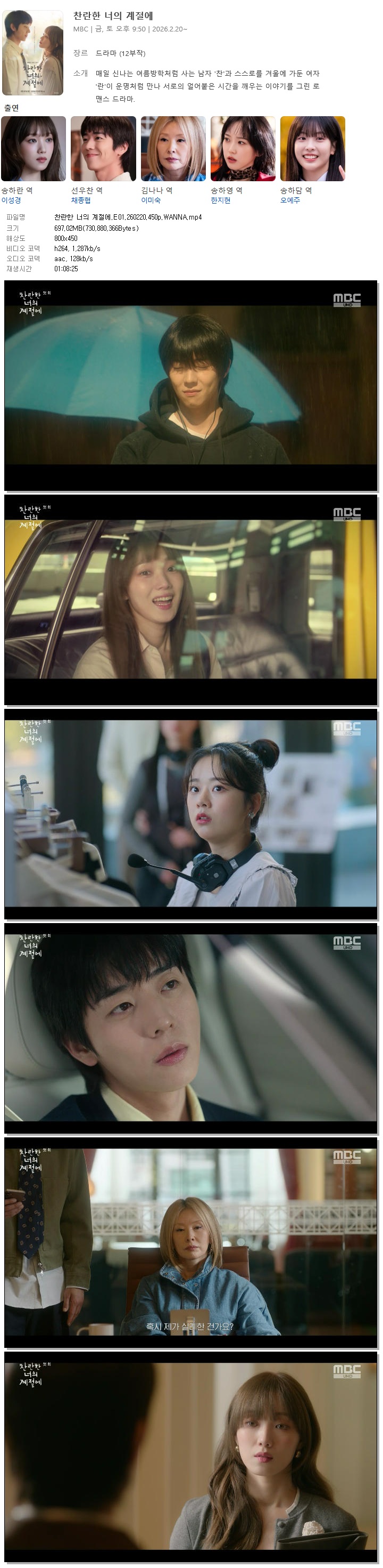| [MBC] 찬란한 너의 계절에.E01.260220.450p.WANNA[이성경, 채종협].mp4 | 697 M | 01:08:25 | 800x450 |