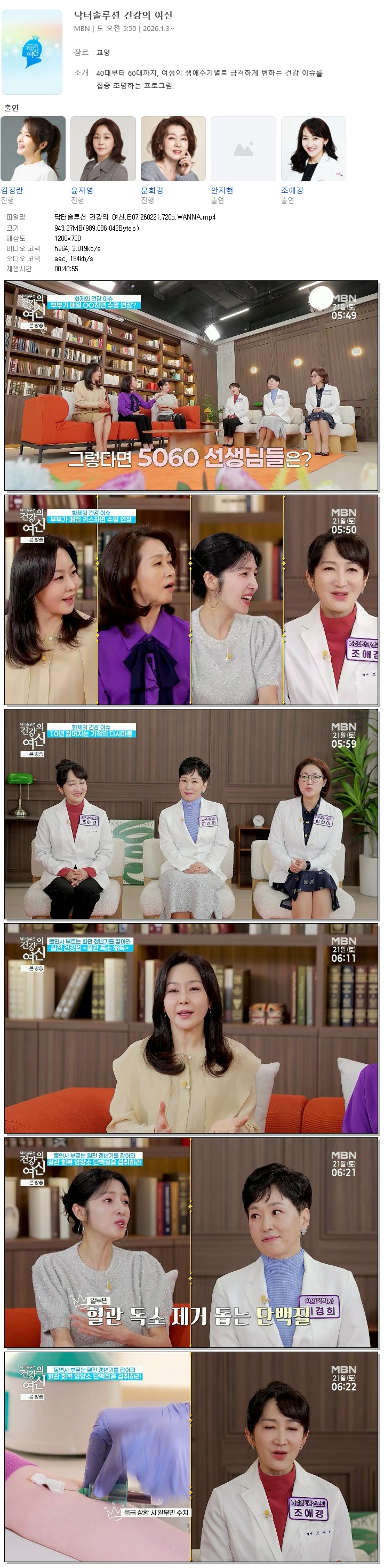 [MBN] 닥터솔루션 건강의 여신.E07.260221.720p.WANNA[김경란, 윤지영].mp4 943.3 M 00:40:55 1280x720