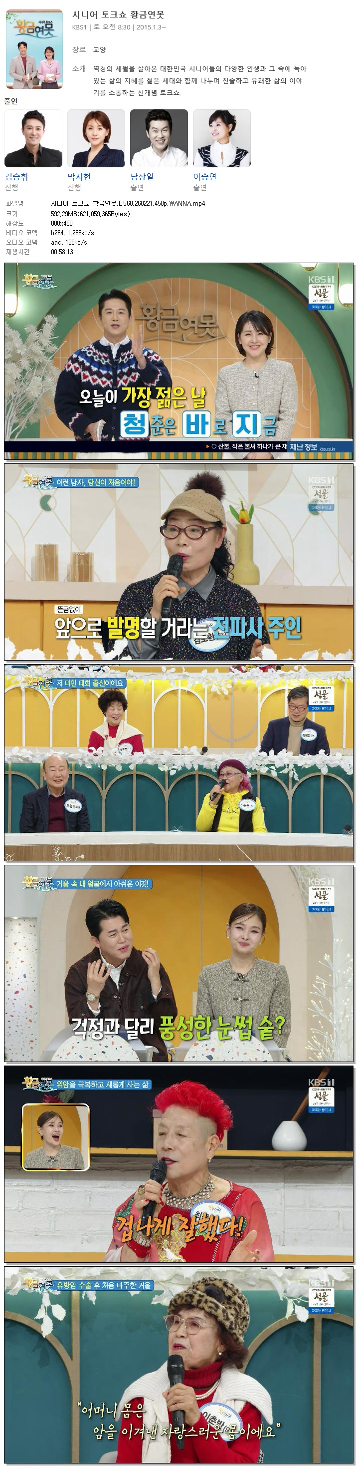 | [KBS1] 시니어 토크쇼 황금연못.E560.260221.450p.WANNA[김승휘, 박지현].mp4 | 592.3 M | 00:58:13 | 800x450 |