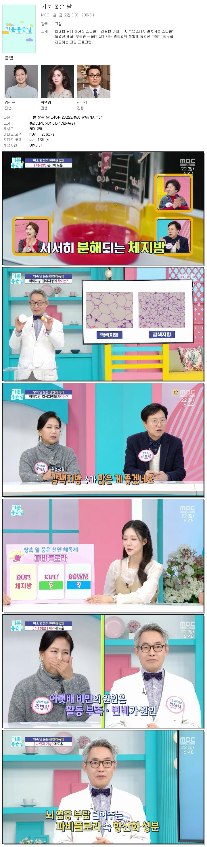 ■ 영원한 트로트의 황제 송대관도 끝내 넘지 못한 암 가족과도 같았던 태진아가 생각하는 송대관의 담도암 발병 원인은? 기분 좋은 날 본방 사수하세요! ■ 가족 암 간병을 둘러싼 가족 갈등 아픈 부모 간병하는 아들은 단 20명 중 1명! 간병하는 가족 대부분이 여성일 수밖에 없는 주요 원인은? 기분 좋은 날에서 함께 하세요 ■ 노년 건강을 무너뜨리는 암 가족의 삶도 예외는 아니다! 재연 드라마로 보는 암 투병 중에도 이어진 시댁의 막말로 이혼 결심 암 보험금 재산 분할 된다? 안 된다? 기분 좋은 날에서 놓치지 마세요! ■ 수술로 끝나지 않는 암 환자의 걱정 막대한 치료비 부담까지 이어진다! 암 환자가 꼭 알아야 할 지원 제도와 놓치지 말아야 할 암의 전조 증상은? 기분 좋은 날에서 알려드립니다 ■ 영양 전달과 노폐물 배출 저하는 각종 바이러스 감염의 원인이다?! 영양소를 전신으로 운반하는 <알부민> 알부민이 혈관 건강에 도움 되는 이유와 섭취법까지 기분 좋은 날에서 해결해 드립니다!
