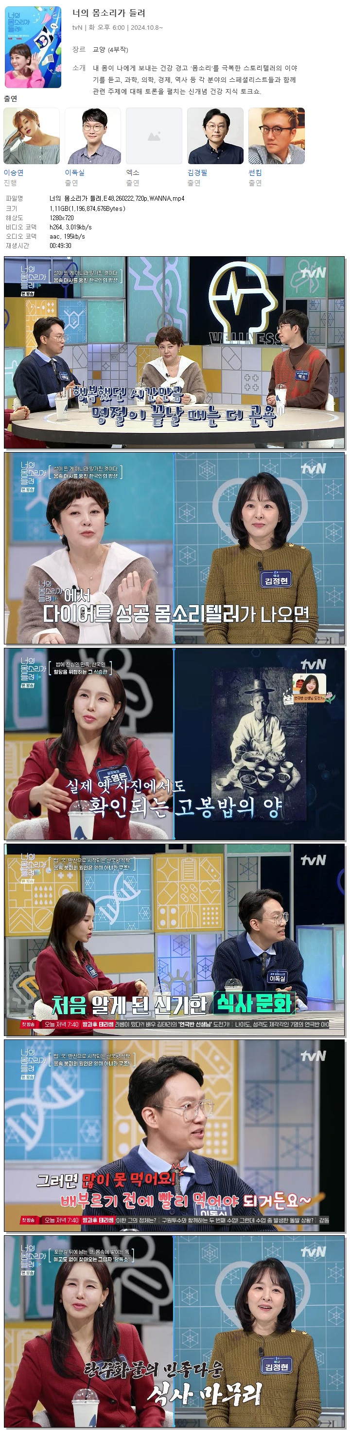 | [TVN] 너의 몸소리가 들려.E48.260222.720p.WANNA[이승연, 이독실].mp4 | 1.1 G | 00:49:30 | 1280x720 |