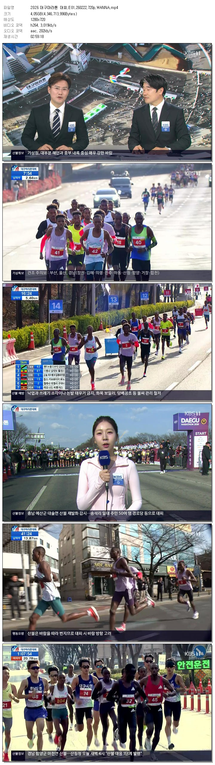 | [KBS1] 2026 대구마라톤 대회.E01.260222.720p.WANNA.mp4 | 4 G | 02:59:18 | 1280x720 |
