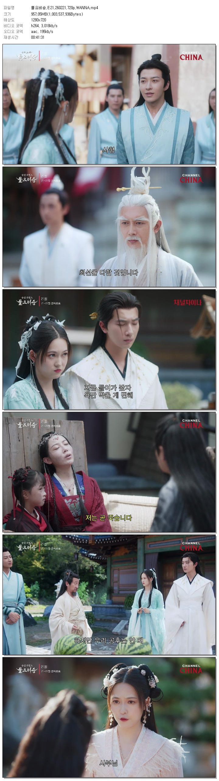 | [채널차이나] 물요비승.E21.260221.720p.WANNA[이굉의, 육정옥].mp4 | 957 M | 00:41:31 | 1280x720 |